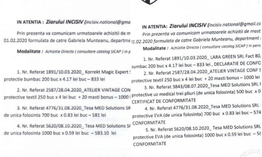Astfel, in adresa nr 805/17.02.2021, sub semnatura aceluiasi sef de birou Achizitii din cadrul CSM Ploiesti sunt specificate urmatoarele societati de unde s-au achizitionat masti de catre institutia publica: Lara Green SRL, Atelier Vintage Conf SRL, si Tesa Med Solutions SRL.