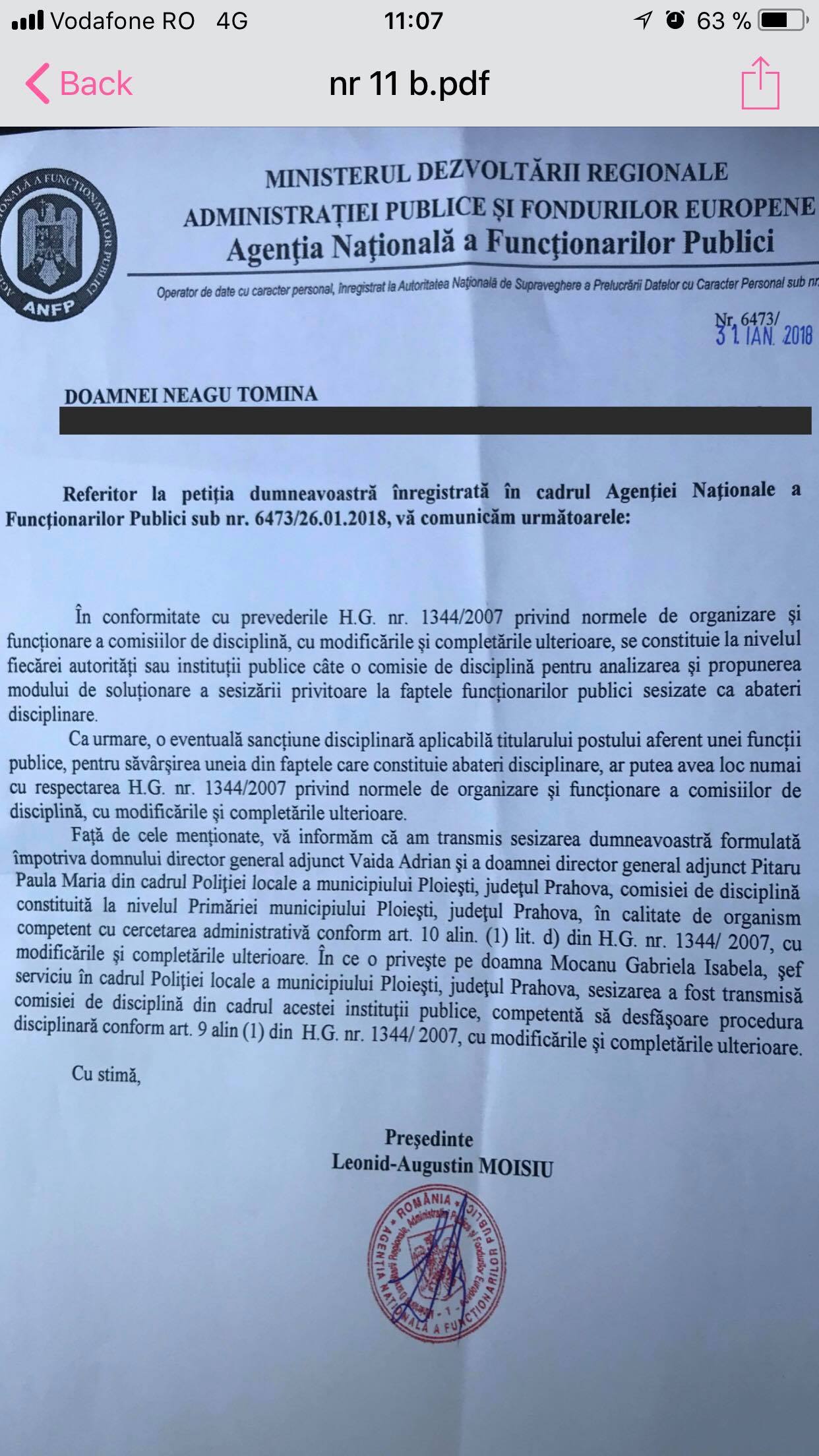 - La inceputul anului 2018, urmare a sesizarii politistei locale Neagu Tomina dar si a Agentiei Nationale a Functionarilor Publici, Comisia de Disciplina a Primariei avea obligatia legala sa se intruneasca pentru cercetarea administrativa a numitilor Adrian Vaida si Pitariu Paula Maria, conform adresei ANFP dar si adresei primarului Adrian Dobre.