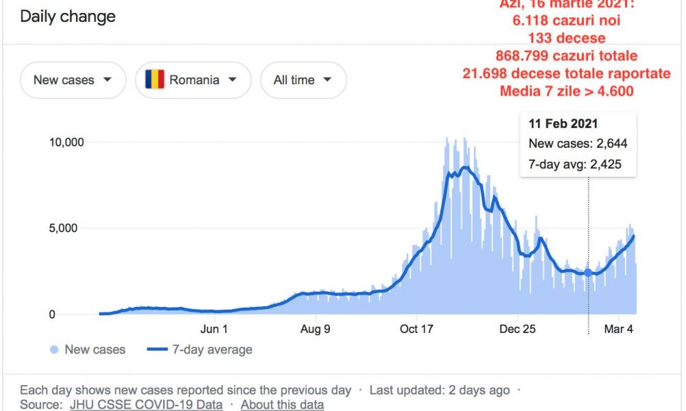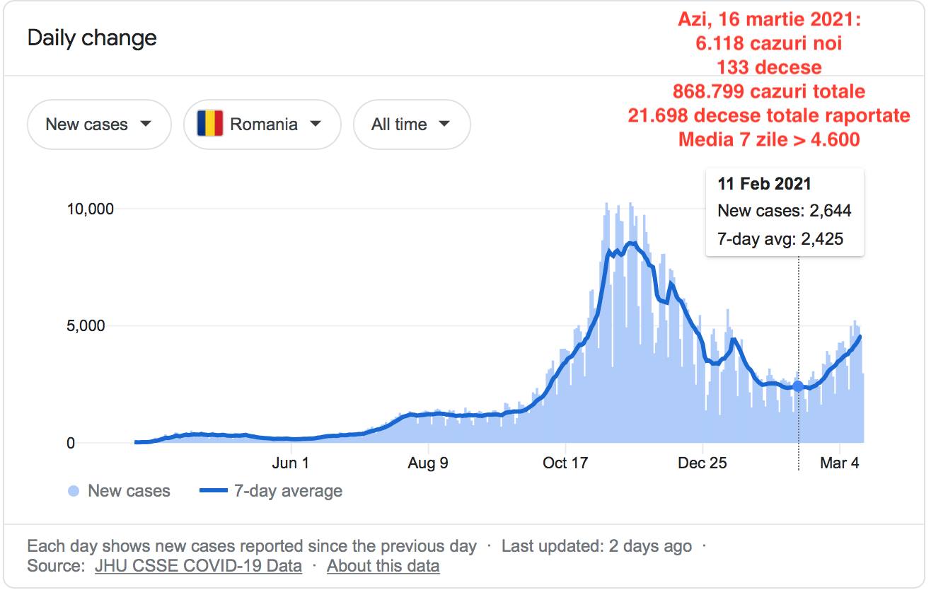 Klaus Iohannis, 11 februarie 2021: ,,Ne-am uitat la scolile din Romania care s-au redeschis fizic pentru copii în semestrul II si pot sa va spun ca situatia este bună”. În 11 februarie 2021, au fost înregistrate 2.644 de cazuri noi, un total de 755.126 de cazuri și 65 de decese în ultimele 24 de ore (până la un total de 19.200 de decese) și o medie a infectărilor nou depistate în ultimele 7 zile de 2.425 de cazuri. Astazi, 16 martie 2021 (33 de zile mai tarziu), suntem la 116.733 de îmbolnăviri în plus (până la un total de 868.799), 133 de decese în ultimele 24 de ore (dublu față de 11 februarie 2021) și 2.498 de decese mai tarziu, cu un numar de cazuri noi de infectare de 6.118, ceea ce duce media infectărilor în ultimele 7 zile la peste 4.600. Familiile celor 2.498 de persoane decedate în ultimele 34 de zile ar avea suficiente motive să creadă că în 11 februarie 2021 situația nu era bună. La fel ca și cele 116.733 de persoane nou infectate COVID de la momentul în care situația ,,era bună” până astăzi, 17 martie 2021, conchide analistul Radu Teodor Soviani. (Cerasela N.).