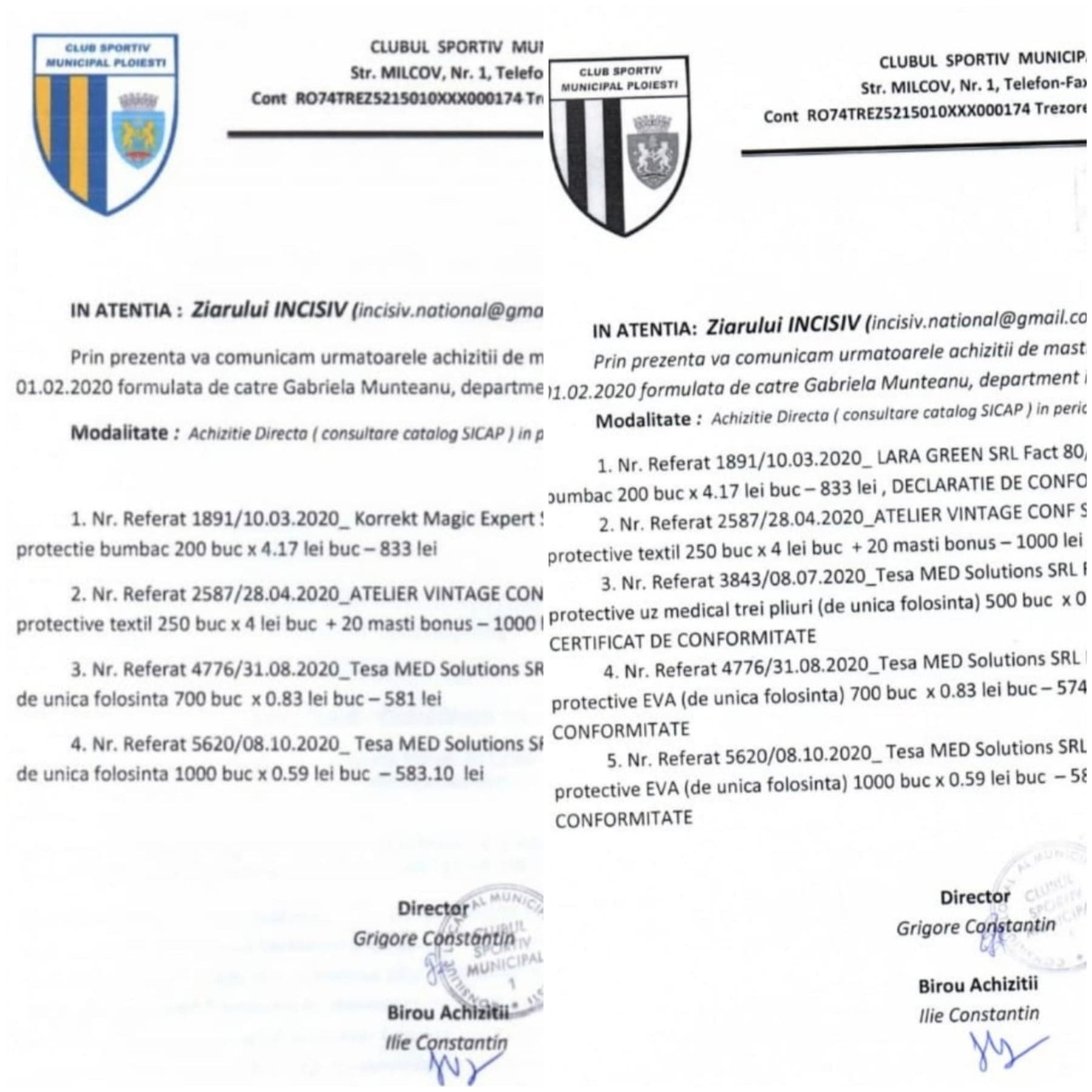 Astfel la o solicitare privind achizitia de catre CSM Ploiesti de tipuri de măşti de protecţie neconforme în acestă perioadă marcată de Covid-19, institutia s-a intrecut pe sine si a emis doua adrese, cu acelasi numar, la date diferite si cu continut diferit, intr-o incercare disperata de a acoperi ilegalitatile comise.