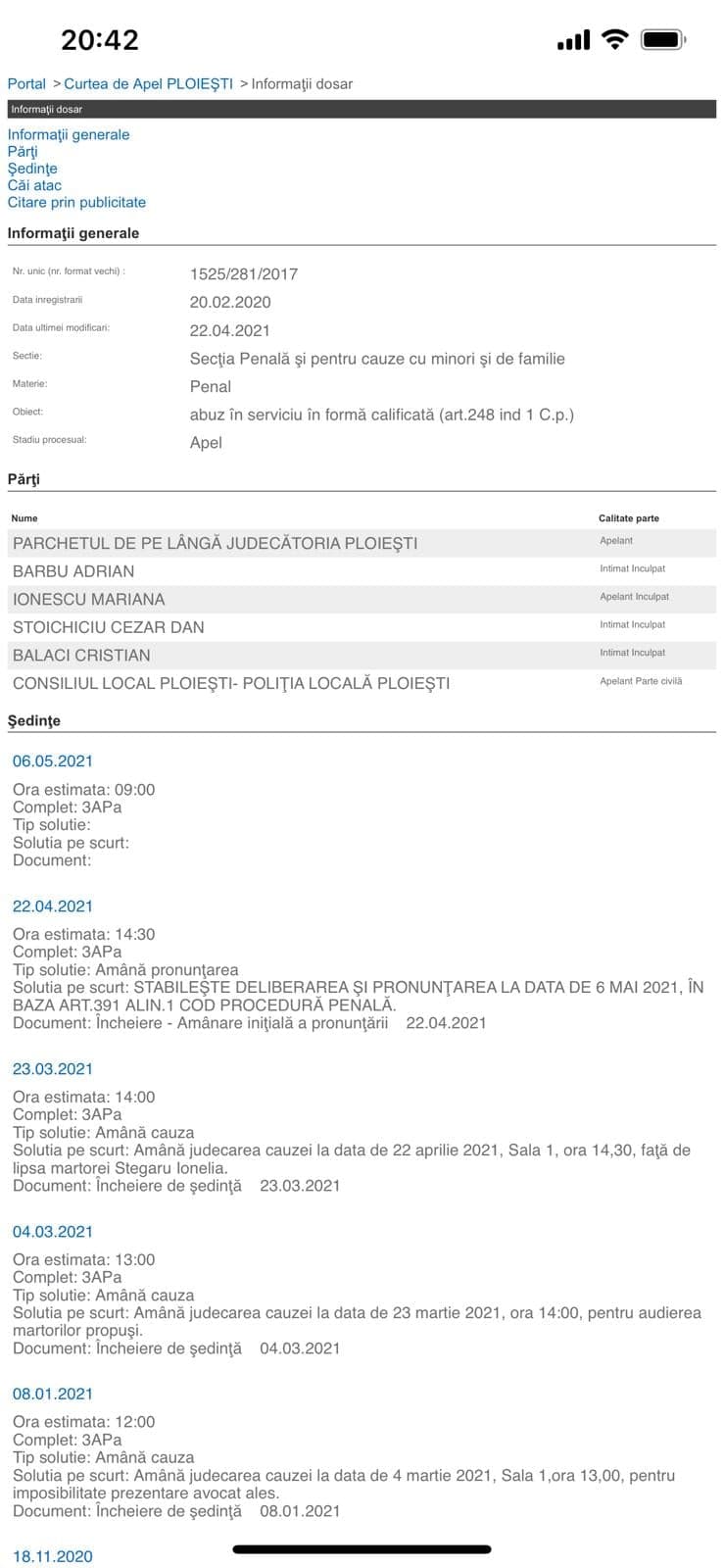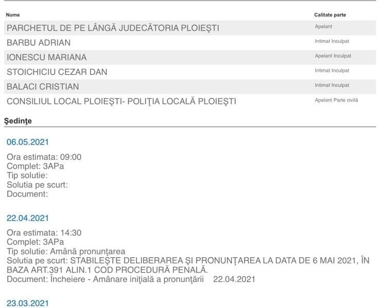 Ieri, in dosarul nr 1525/281/2017, Curtea de Apel Ploiesti a ramas in pronuntare, stabilind deliberarea si pronuntarea pentru data de 06.05.2021.