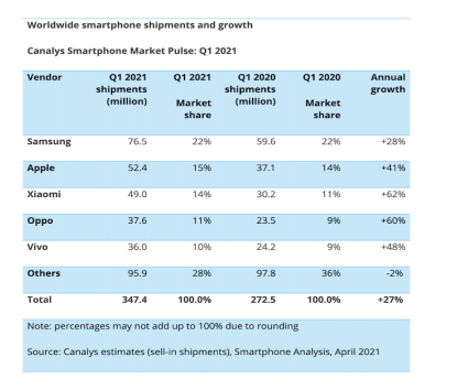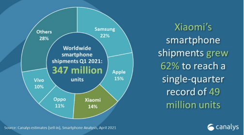 Canalys Smartphone Market Pulse: Q1 2021 a anunțat că Xiaomi a realizat la nivel global cea mai bună performanță trimestrială din istorie, cu o creștere de 62% și livrări de 49.0 milioane de unități. Xiaomi a avut cea mai mare creștere anuală a livrărilor în primul trimestru din 2021 dintre primele cinci branduri de telefoane inteligente.