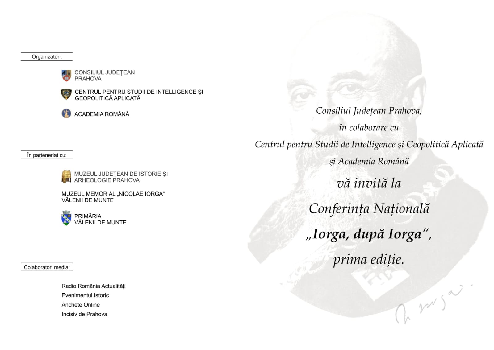 Consiliul Județean Prahova și Muzeul de Istorie și Arheologie Ploiești, în parteneriat cu Centrul pentru Studii de Intelligence și Geopolitică Aplicată și Academia Română, având ca parteneri media, Radio România Actualități, Ancheteonline.ro, Evenimentul Istoric si Ziarul Incisiv de Prahova organizează la Muzeul ”Nicolae Iorga” de la Vălenii de Munte, prima ediție a Conferinței Naționale ” Iorga, după Iorga”, dedicată vieții, activității, operei și învățămintelor sale lăsate generațiilor care au urmat.