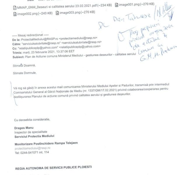 La data de 23.02.2021, Garda de Mediu Prahova a inaintat o adresa catre UAT Ploiesti, RASP Ploiesti si Politia Locala Ploiesti cu privire la “Plan de Actiune comuna Ministerul Mediului- gestiunea deseurilor-calitatea aerului” comunicata de Ministerul Mediului Apelor si Padurilor, transmisa prin intermediul Comisariatului General al Garzii Nationale de Mediu (nr.1337/GM/17.02.2021), prin care s-a informat ca pe teritoriul Municipiului Bucuresti se desfasoara incepand cu luna februarie a acestui an o actiune comuna privind calitatea aerului si gestiunea deseurilor la care particpa comisari ai Garzii Nationale de Mediu, reprezentanti ai Politiilor Locale ale Sectoarelor Municipiului Bucuresti si repreznetanti ai Unitatilor teritorial-administrative ale sectoarelor Municipiului Bucuresti si a solicitat analizarea oportunitatii desfasurarii unor astfel de actiuni impreuna cu reprezentanti ai Comisariatelor Judetene ale Garzii de Mediu si ai Politiilor Locale ale municipiilor resedinta de judet.