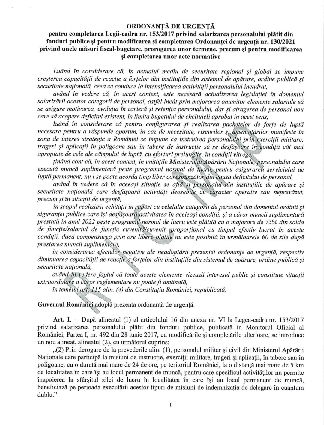 Conform unui proiect de ordonanță de urgență a Guvernului transmis structurilor de apărare, ordine publică și securitate națională, începând cu data de 1 iulie 2022, cuantumul brut salariilor de funcție se stabilește la nivelul salariilor de funcție prevăzute în Legea cadru nr. 153/2017, pentru anul 2022, dezvaluie sindicatul Europol.