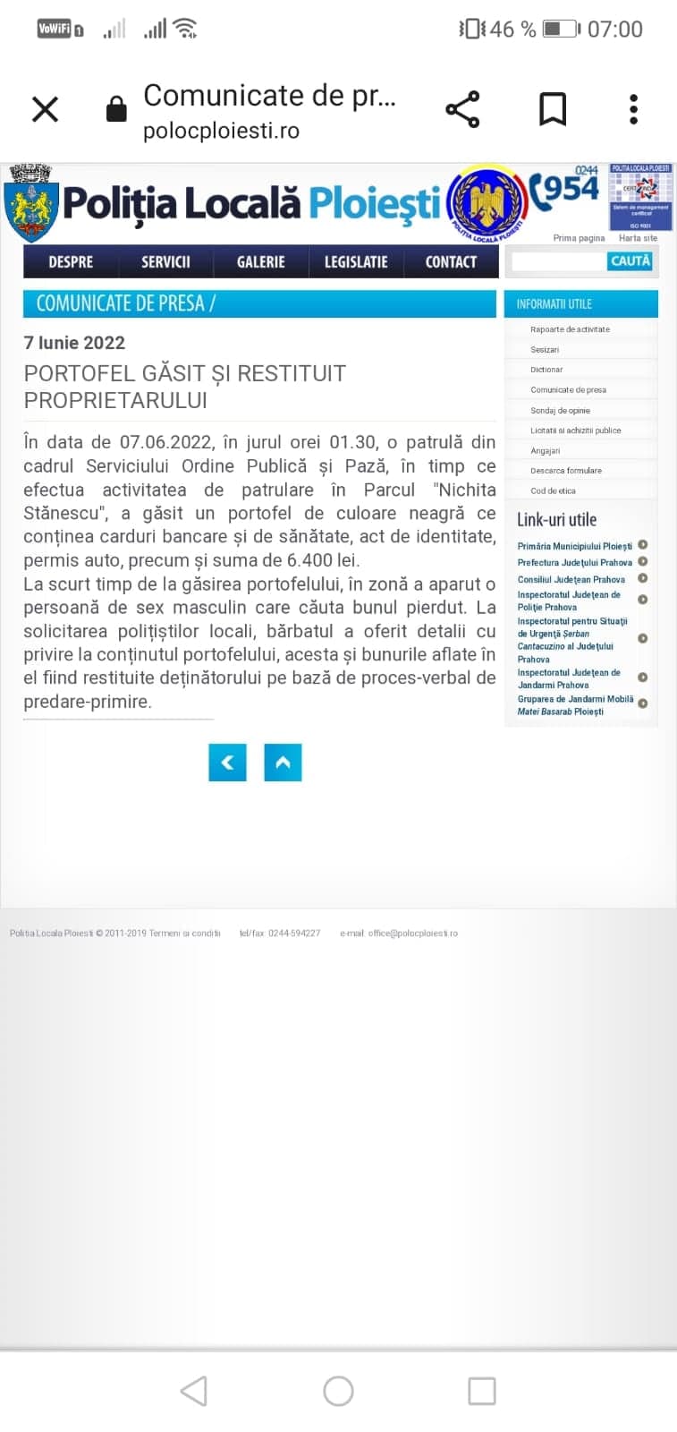 În data de 07.06.2022, în jurul orei 01.30, o patrulă din cadrul Serviciului Ordine Publică și Pază, în timp ce efectua activitatea de patrulare în Parcul „Nichita Stănescu”, a găsit un portofel de culoare neagră ce conținea carduri bancare și de sănătate, act de identitate, permis auto, precum și suma de 6.400 lei.