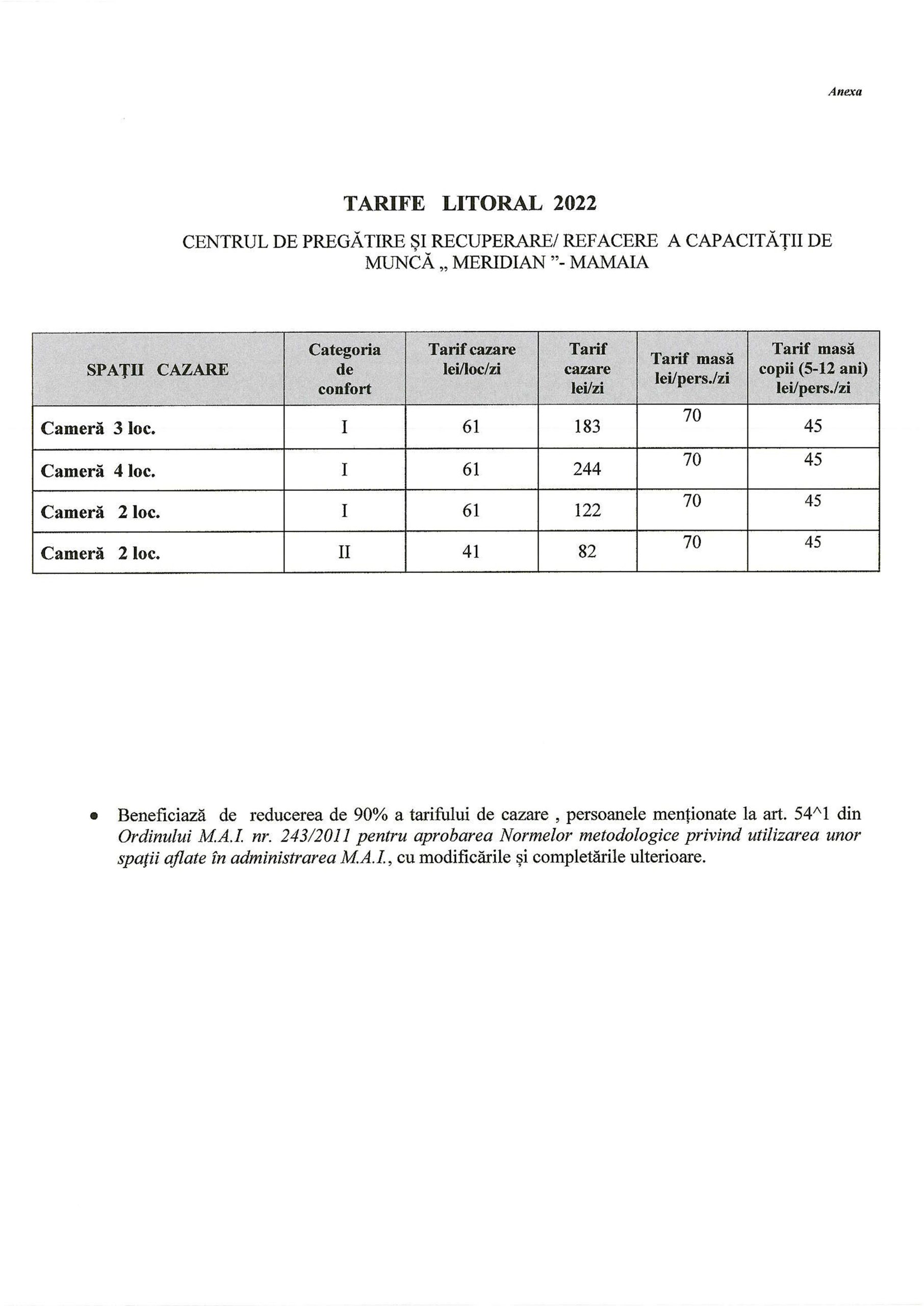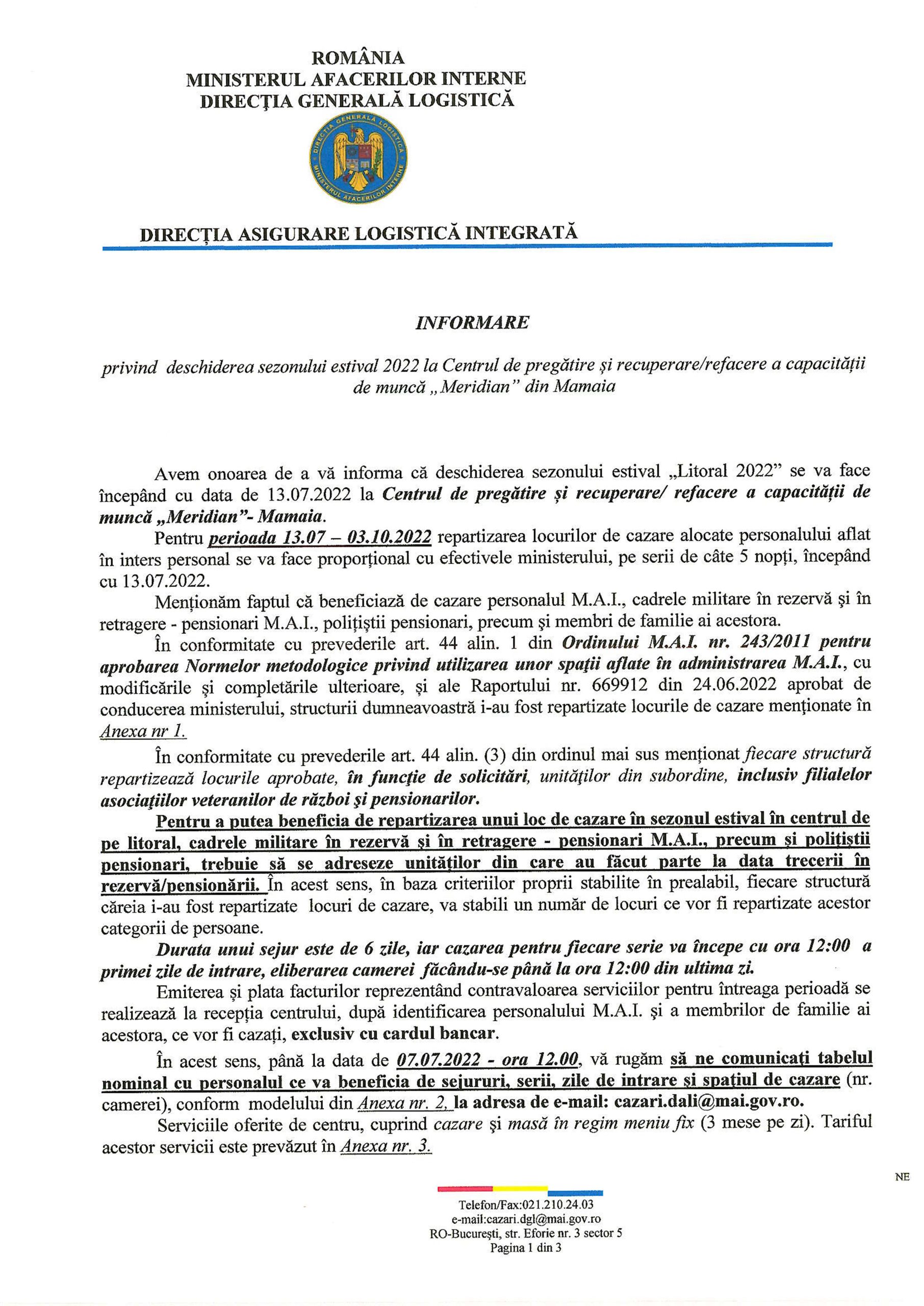 Direcția Asigurare Logistică Integrată din MAI a emis o informare cu privire deschiderea sezonului estival ”LITORAL 2022” începând cu data de 13.07.2022 la Centrul de pregătire și recuperare/refacere a capacității de muncă “Meridian”-Mamaia din subordinea MAI. La începutul săptămânii viitoare, la nivelul fiecărei structuri teritoriale se vor repartiza biletele la mare în funcțiile de criteriile stabilite la nivel de unitate.