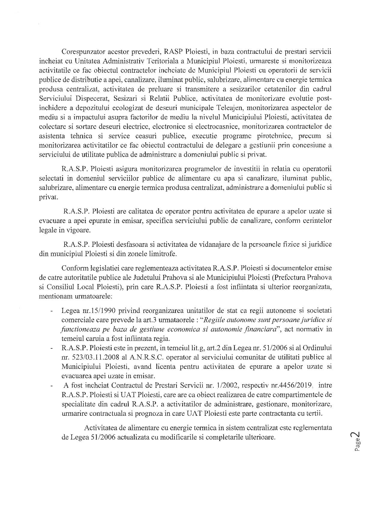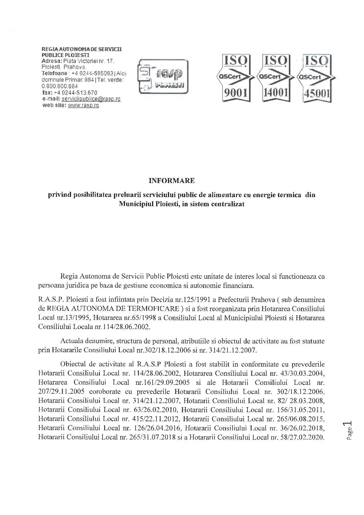 Anexat – Informarea RASP cu privire la posibilitatea preluării serviciului public de alimentare cu energie termică din Municipiul Ploieşti, în sistem centralizat”.