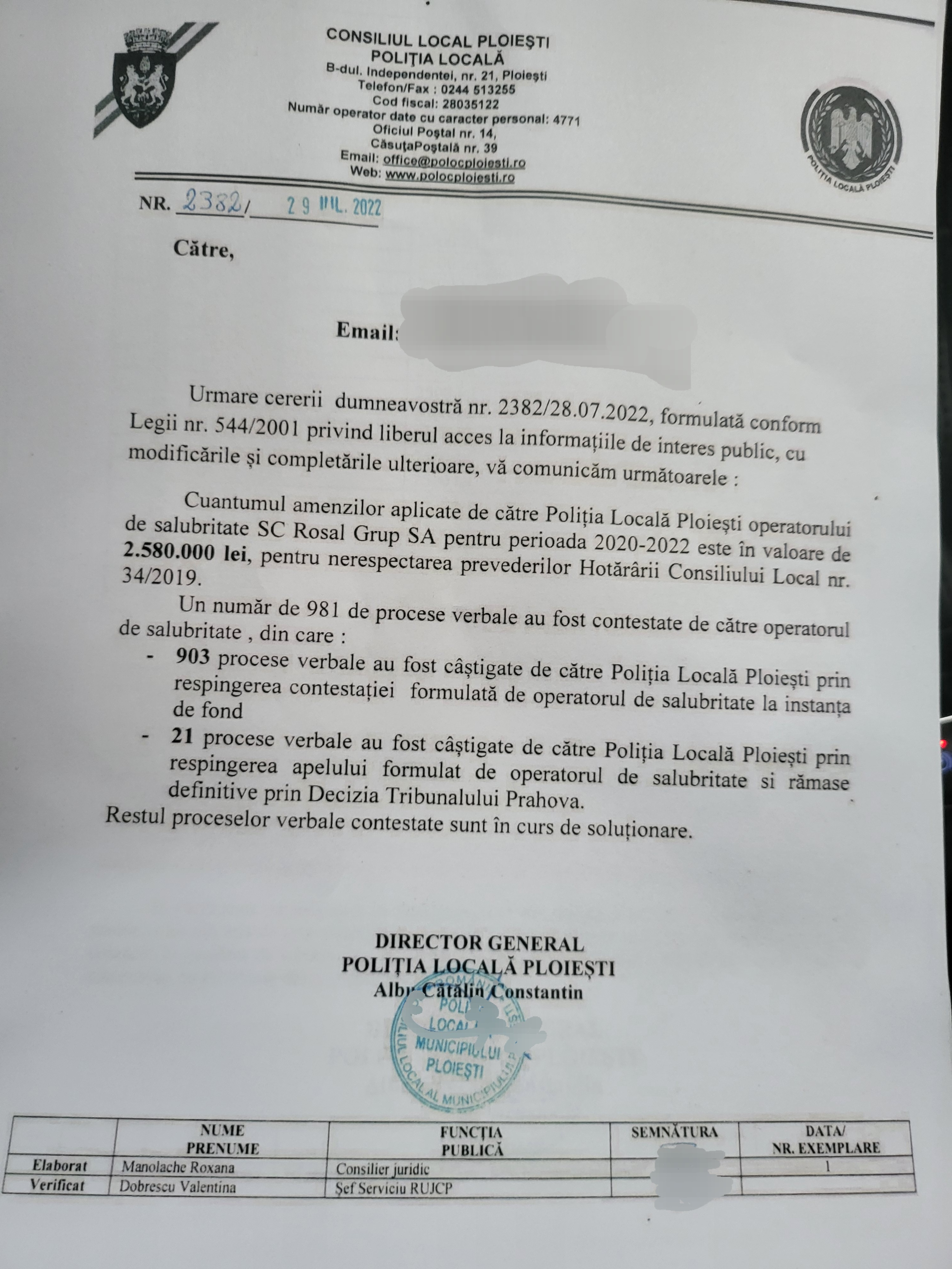” Urmarim cu interes vadit dezvaluirile facute in ziarul Incisiv de Prahova, dezvaluiri care confirma si completeaza datele si informatiile detinute de noi si organele de cercetare penala, la aceasta ora…”…”Referitor la ultimele dezvaluiri privind falsul emis de Politia Locala Ploiesti prin adresa 2382 din 29 iulie 2022, precizam ca nu stiam cine sunt semnatarii acestei adrese, aceasta fiind publicata de catre dumneavoastra fara semnatari, pana azi. Dupa publicarea adresei in cauza cu semnatarii acesteia, in data de 16.08.2022, in articolul „Legaturi periculoase: Primarul Andrei Volosevici, bugetul local, BLUE PLANET SERVICES S.R.L., Solid Waste Operation SRL, Bogdan Niculescu, IPJ Prahova si crima organizata (II)”, va putem preciza ca vom depune maine (n.r – azi, 17.08.2022), prin avocati, plangere penala impotriva directorului general al Politiei Locale Ploiesti (N.R- Albu Catalin Constantin, nasul edilului Andrei Volosevici), Manolache Roxana si Dobrescu Valentia pentru abuz in serviciu si fals deoarece sunt functionari publici care in exercitarea atributiilor de serviciu au intocmit un act defectuos care a cauzat o paguba societatii unde subsemnatul este actionar, prin deformarea adevarului si inducerea in eroare a opiniei publice”…Vom reveni. (Ec Adrian Radu).