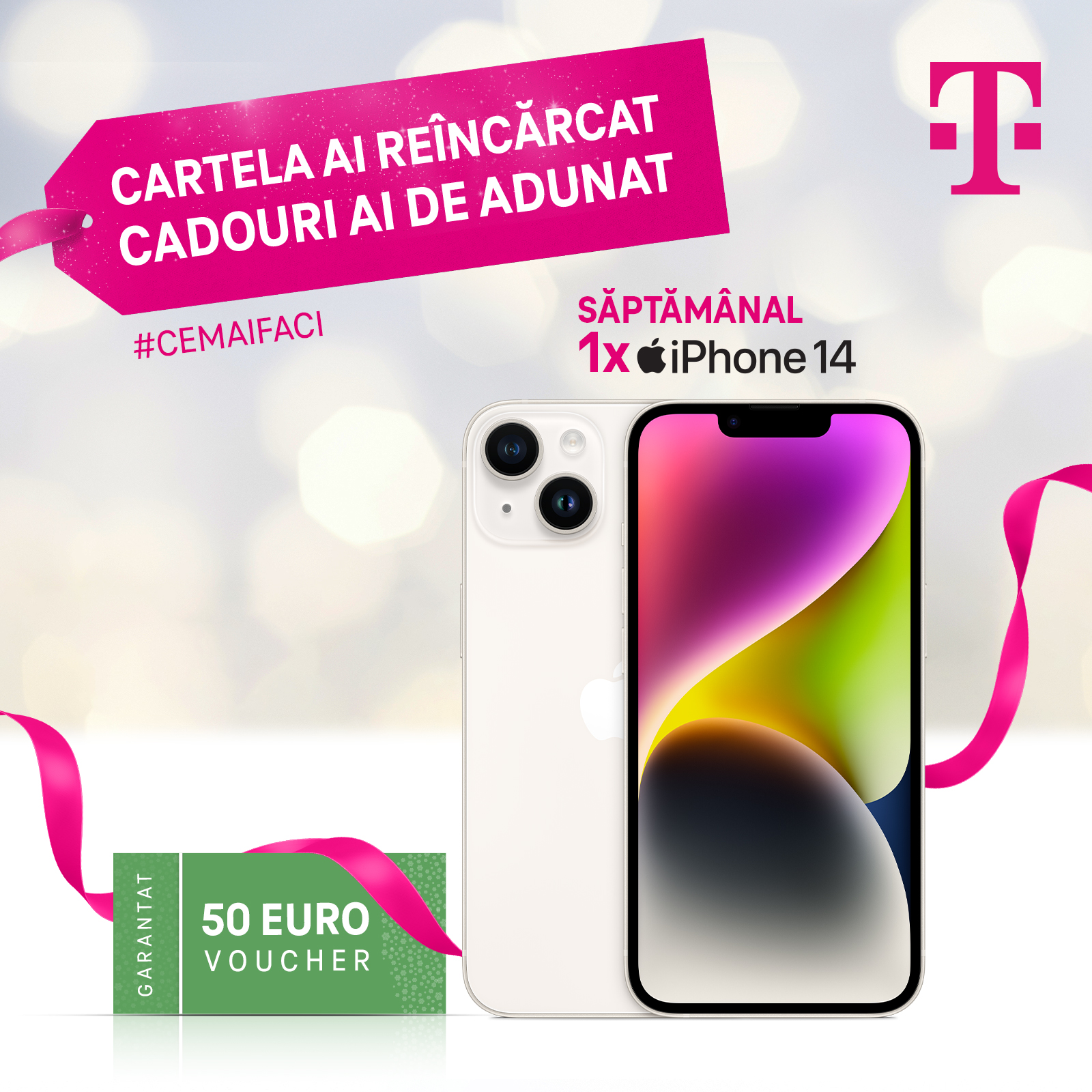 - 6 telefoane iPhone 14 oferite prin tragere la sorți, câte unul pentru fiecare săptămână de campanie, dacă reîncarcă orice cartelă Telekom cu minimum 5 euro credit.