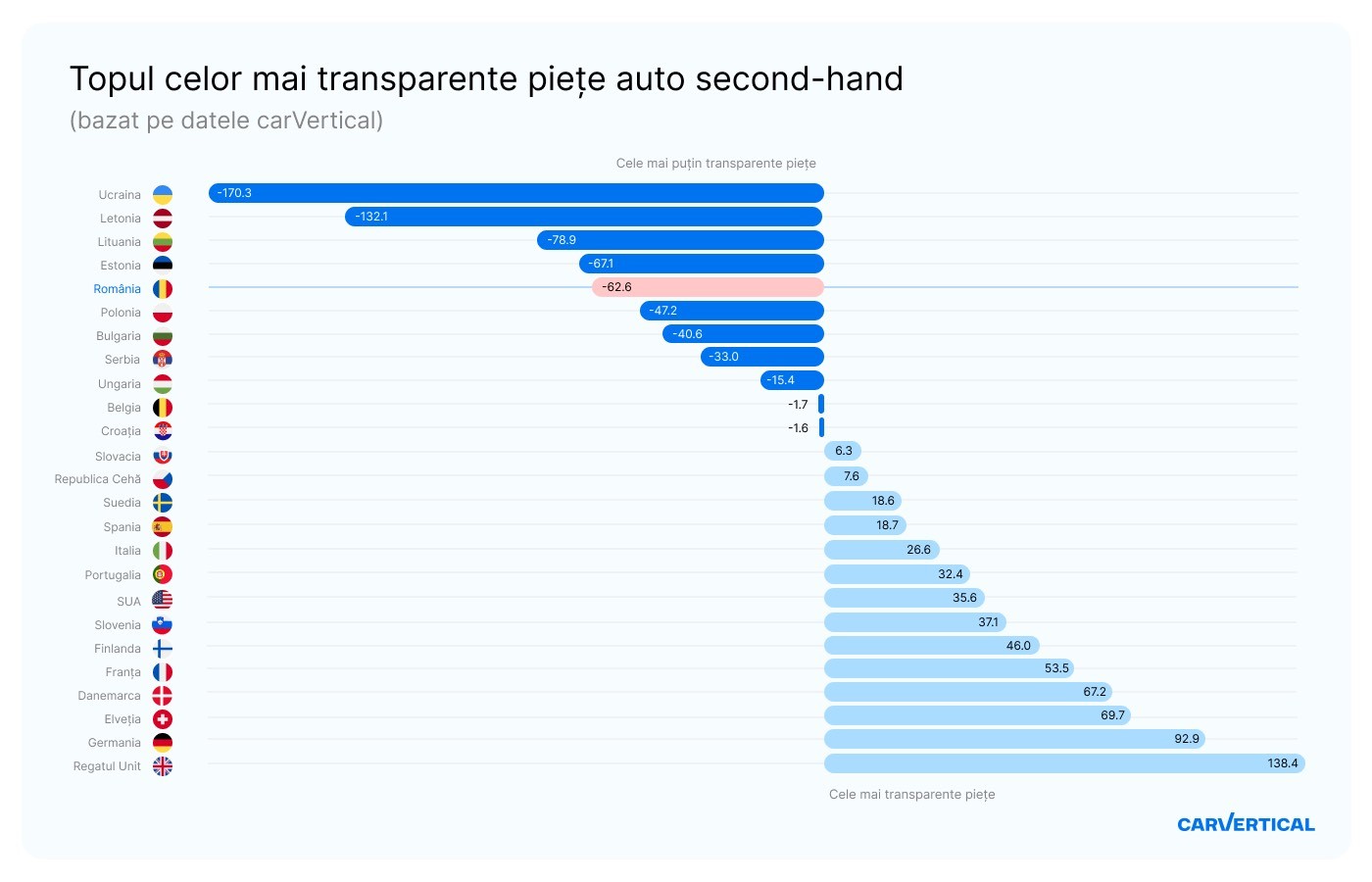 România are una dintre cele mai puțin transparente piețe de mașini rulate din Europa. La polul opus, țările în care există un nivel ridicat de transparență pe piața auto second-hand sunt: Regatul Unit, Germania și Elveția. carVertical lansează în România „Indexul de Transparență”, un raport complex care analizează tranzacțiile cu mașini rulate din Europa, prezentând clasamentul celor mai transparente piețe auto second-hand.
