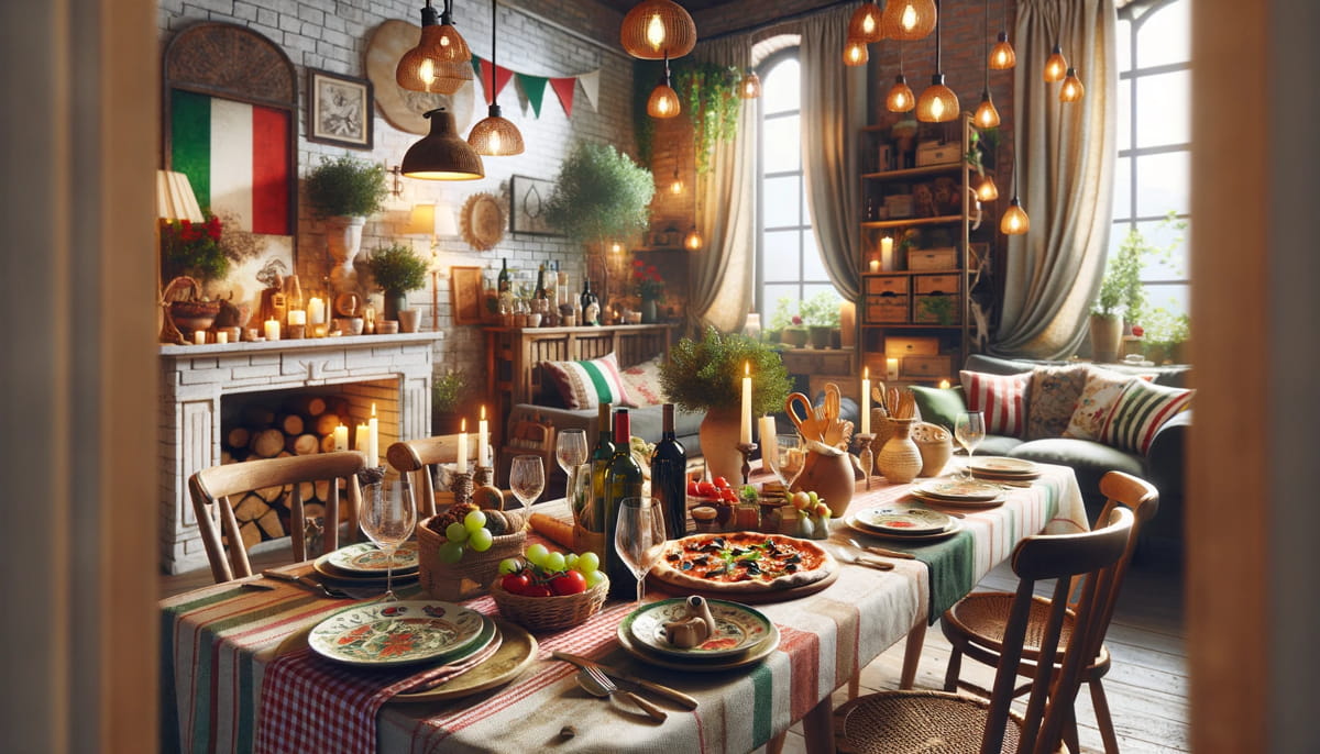 Spre exemplu poți folosi culori inspirate din steagul Italiei – roșu, alb și verde – și să adaugi elemente rustice, cum ar fi lumânări, farfurii din ceramică și față de masă cu motive italienești.