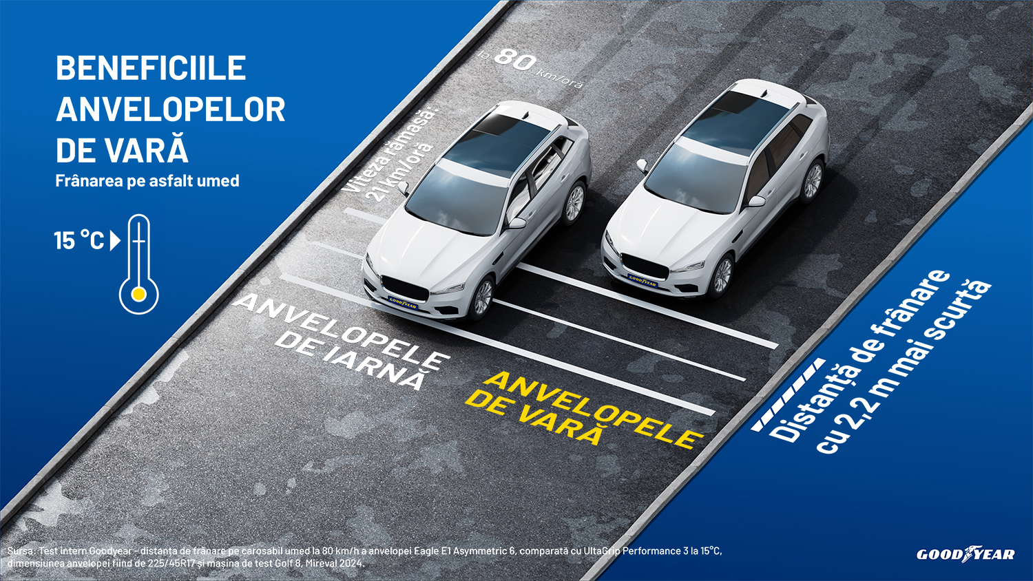București, 28 martie 2024 – Temperaturile au început în sfârșit să crească, așa că Goodyear recomandă șoferilor să treacă la echipamentul de vară. Alegerea anvelopelor potrivite afectează extrem de mult distanțele de frânare, care pot fi de până la 15 metri pe un drum umed la 80 km/h și de 7 metri pe un drum uscat la 100 km/h. Totodată, teste recente au arătat că la frânarea pe un drum umed, în temperaturi de 15 °C și la 80 km/h, anvelopele de iarnă au o distanță de frânare cu aproximativ doi metri mai mare decât cele de vară. 2
