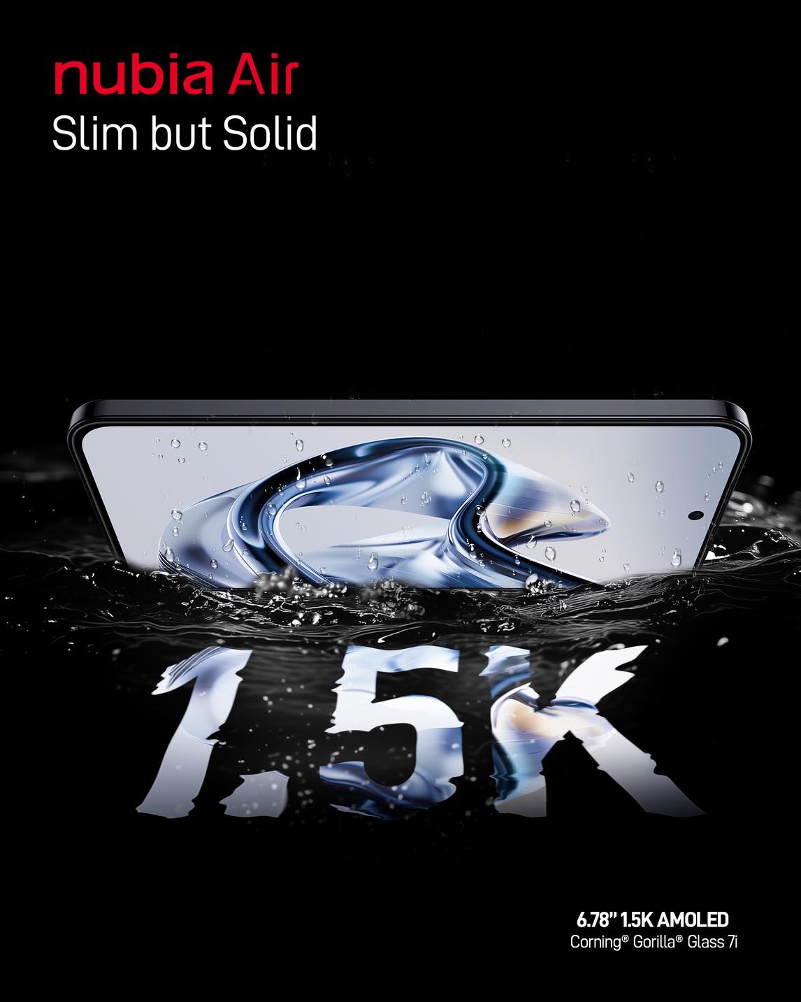 nubia Air este dotat cu un ecran AMOLED de 6,78 inci, rezoluție 1224 × 2720 (1,5K), densitate de 440 PPI, rată de reîmprospătare de 120 Hz și acoperire 100% DCI-P3, atingând o luminozitate maximă de 4500 nits – clar și vibrant chiar și în lumina directă a soarelui. Ecranul este protejat de Corning® Gorilla® Glass 7i, de două ori mai rezistent la căderi pe suprafețe dure precum asfaltul. În plus, este certificat IP68 și IP69, cu protecție IP69K industrială, ceea ce înseamnă că poate rezista la scufundări de până la 1,5 m timp de 30 de minute, la jeturi de apă la temperaturi de 80°C și la presiuni ridicate. Construcția este întărită printr-un cadru din aliaj de aluminiu, cu grosimea mărită a ramei tactile (+30%) și ranforsări interne pe colțuri.